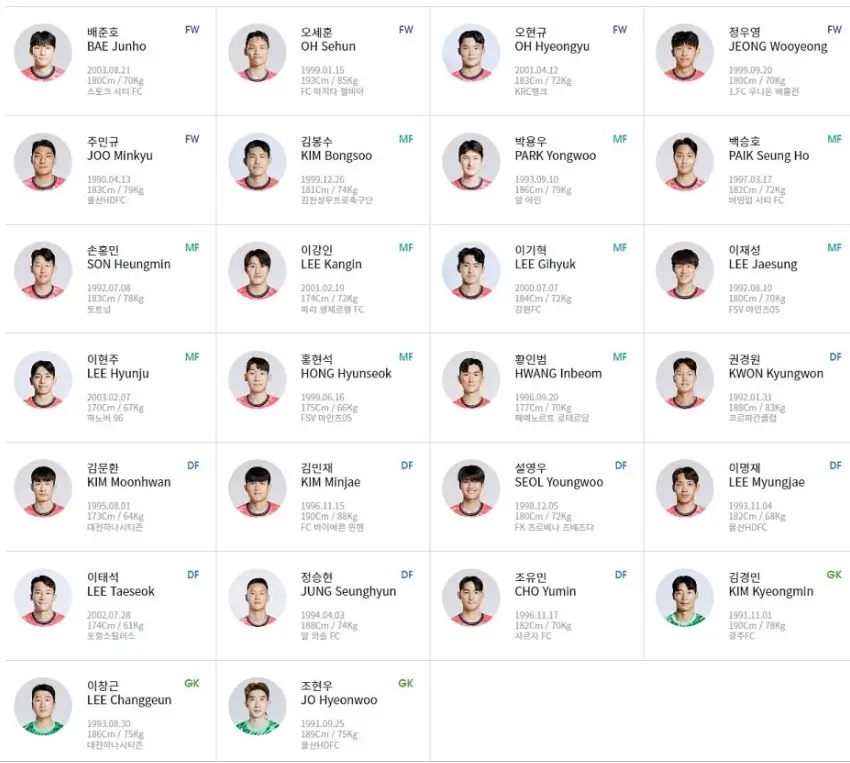 대한민국 선수 정보